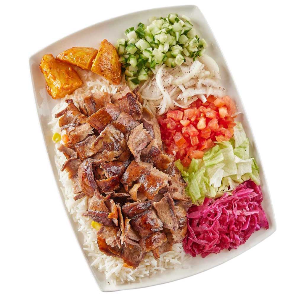 Beef doner, salad, rice and sauces